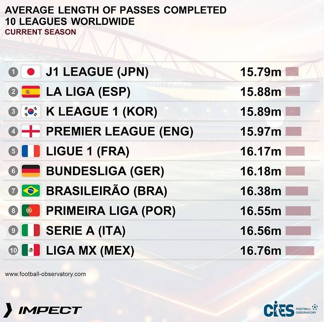 CIES는 해당 통계를 두고 "최다에서 최소까지 평균 패스 길이에 따라 나눈 '티키타카' 플레이 스타일의 10개의 리그"라고 설명했다.