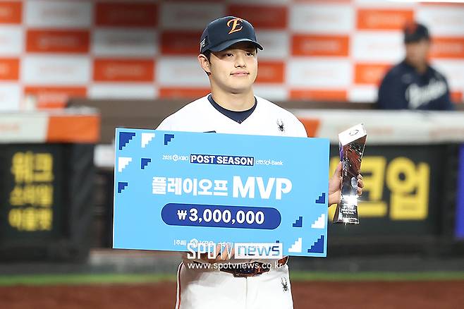 5차전에 등판하지 않았지만 MVP에 선정됐다. 문동주는 "솔직히 (데일리 MVP를)두 번 받았는데 가능성이 있지 않을까 싶었다"며 "잘했다는 생각이 들어서 받으면 기분 좋겠다 생각했다"며 웃었다.