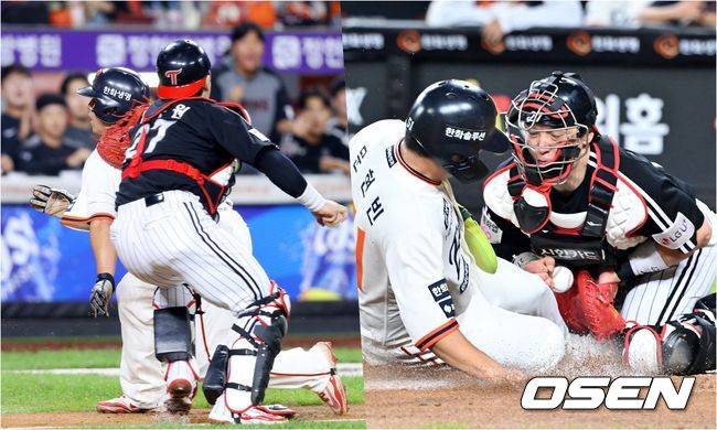 [OSEN=대전, 민경훈 기자] 29일 오후 대전 한화생명볼파크에서 2025 신한 SOL Bank KBO리그 한화 이글스와 LG 트윈스의 경기가 열렸다.한화는 정우주, LG는 임찬규를 선발 투수로 내세웠다.3회말 2사 주자 2루 한화 노시환의 좌익수 앞 안타때 한화 문현빈이 홈으로 몸을 날렸다. LG 포수 박동원이 좌익수 문성주의 홈 송구를 놓치는 포구 실책을 범하면서 한화 문현빈의 득점이 인정됐다. 2025.09.29 /rumi@osen.co.kr