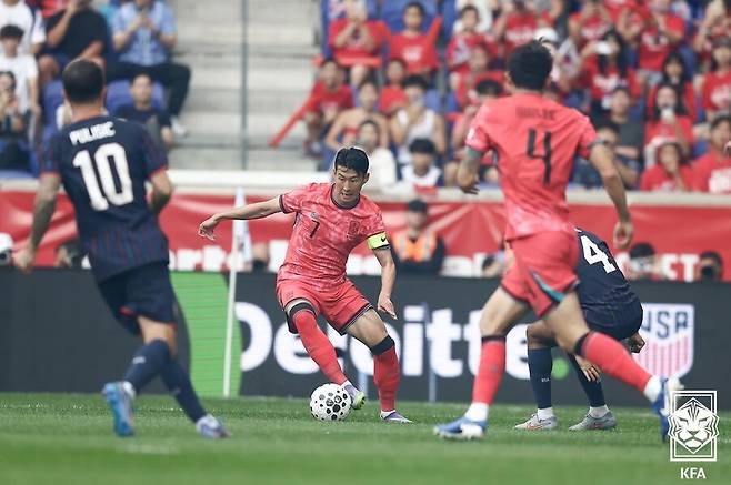 한국은 7일 오전 6시(이하 한국시간) 미국 뉴저지주 해리슨의 스포츠일러스트레이티드 스타디움에서 국제축구연맹(FIFA) 랭킹 15위 팀 미국을 상대했다. 홍명보 감독은 3-4-2-1 전술을 꺼냈다.