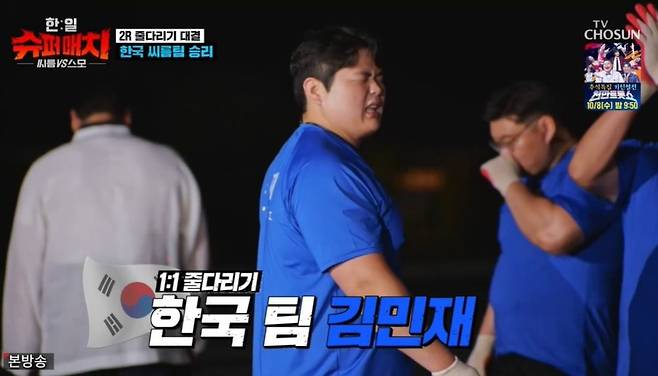 [TV리포트=남금주 기자] 한국 씨름팀 김민재가 사전 대결에서 승리했지만, 일본 스모팀 감독의 항의로 경기가 중단됐다.