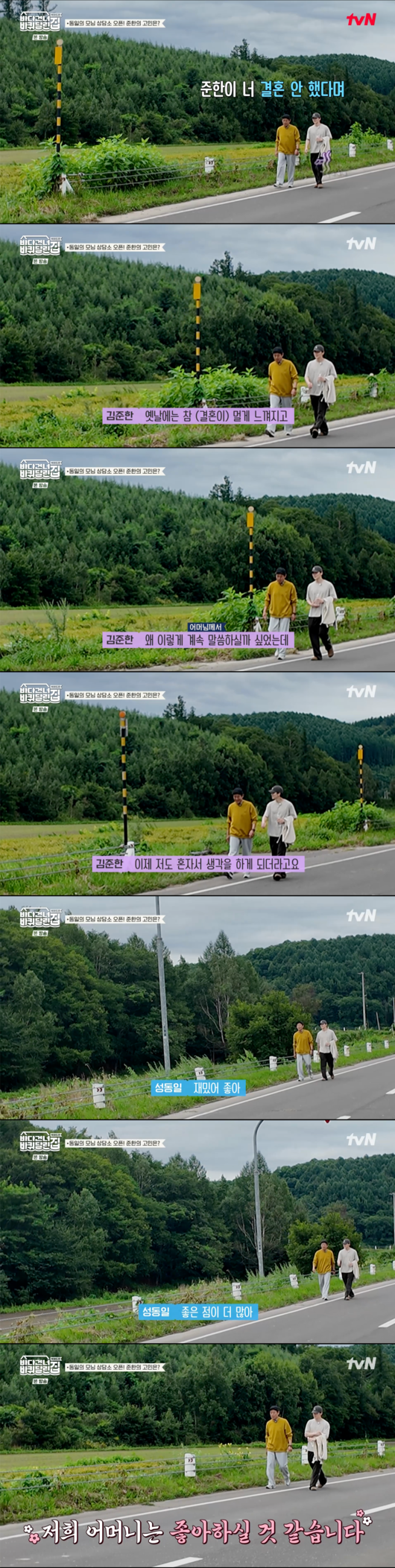 이른 아침 산책을 함께 한 성동일과 김준한은 인생의 중대한 문제인 '결혼'에 대해 깊은 이야기를 나눴다. 이날 성동일은 미혼인 김준한에게 "준한이 너 결혼 안 했다며"라고 운을 떼며 대화를 시작했다.
