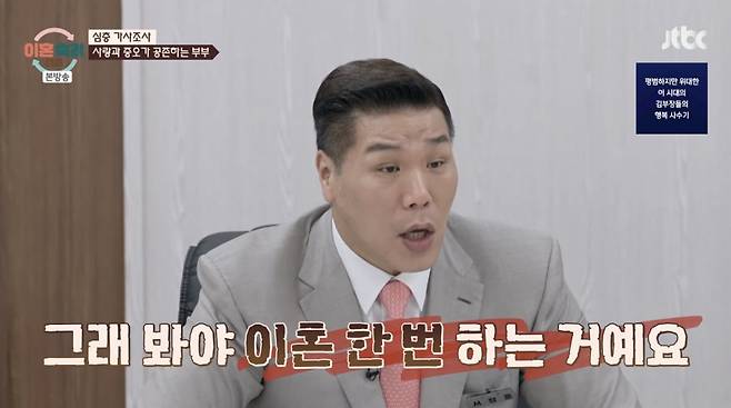 서장훈은 "50퍼센트는커녕 이혼 의사가 0이다. 자기 마음을 속이지 마라. 아내는 아직 젊고 아이 같은 면이 있어 솔직한 표현을 못 하는 것 같다. 너무 불안해하지 마라. 그래봤자 이혼 한 번 하는 거다"고 조언했다.