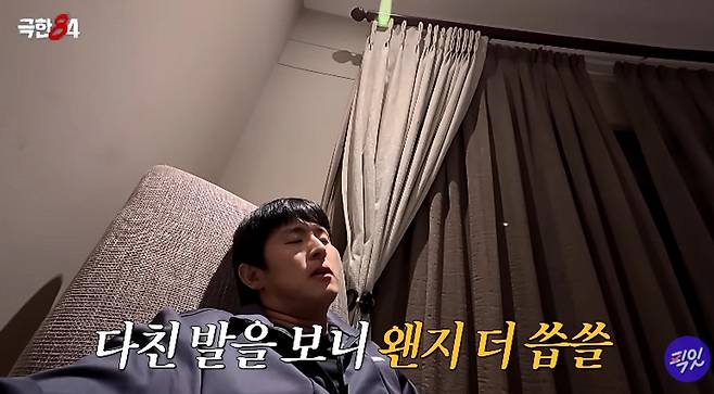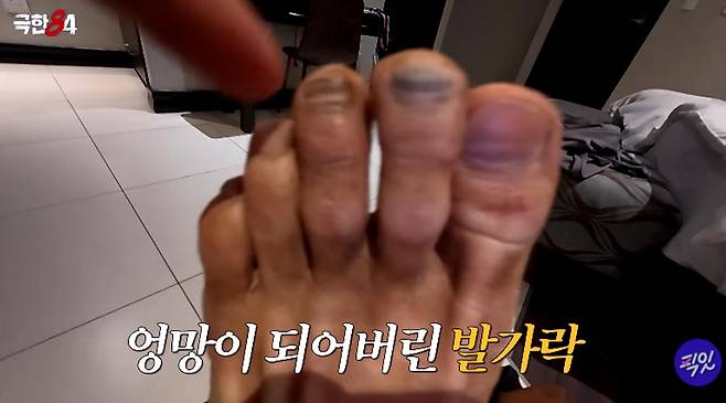 그는 "발톱이 멍들어서 시커매졌다. 누르면 아프다. 이러다 잘못되면 발톱이 빠지기도 한다"라며 고통을 호소했다. 이어 쇼파에 몸을 던진 그는 "씻을 힘도 없다"라며 녹초가 된 모습을 보였다.