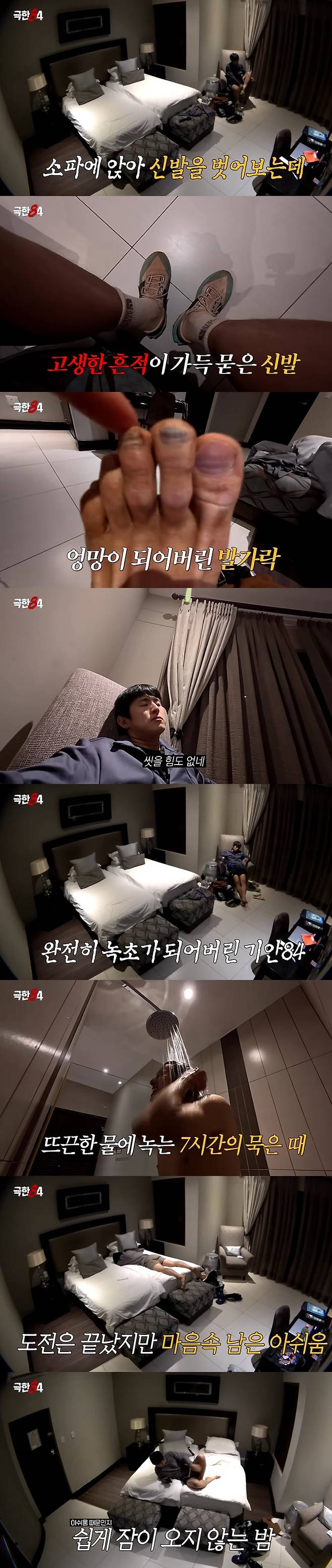공개된 영상 속에는 7시간에 걸친 초극한 마라톤을 마친 후 숙소로 돌아온 기안84의 모습이 담겼다.