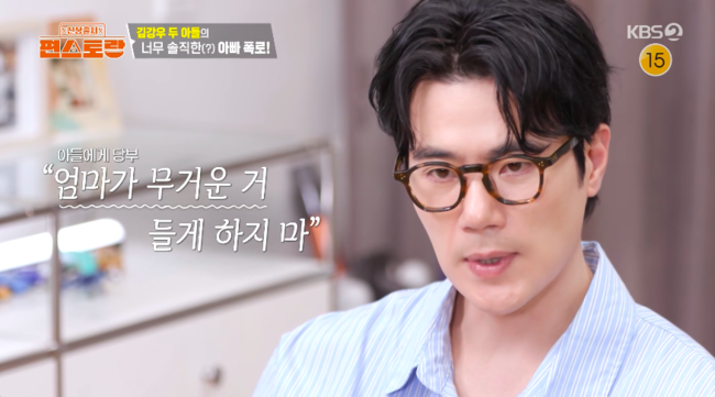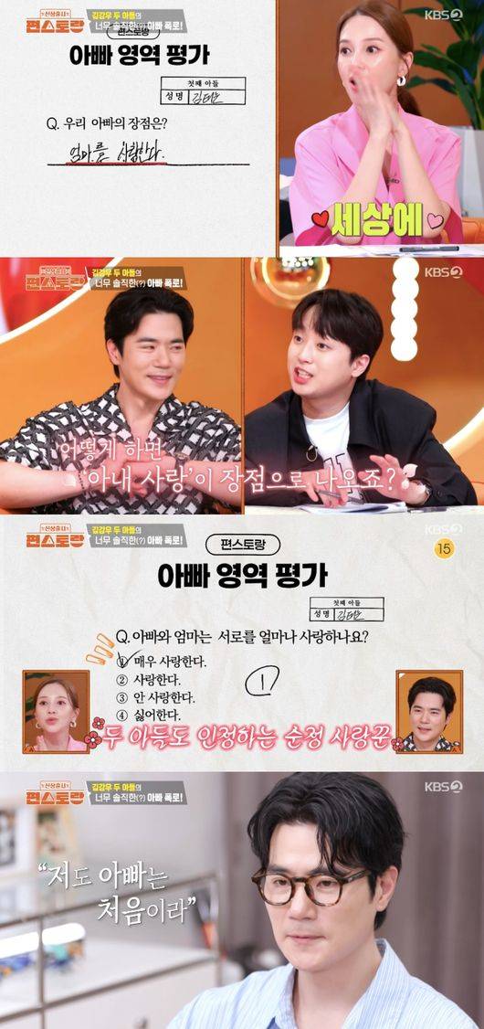 이날 김강우는 두 아들의 ‘아빠 영역 평가’를 확인했다. 아빠의 장점에 대한 질문에 초등학교 6학년 둘째는 “유머러스하다’라고 했고, 중학생 2학년 첫째는 “엄마를 사랑한다”라고 답해 모두를 놀라게 했다.