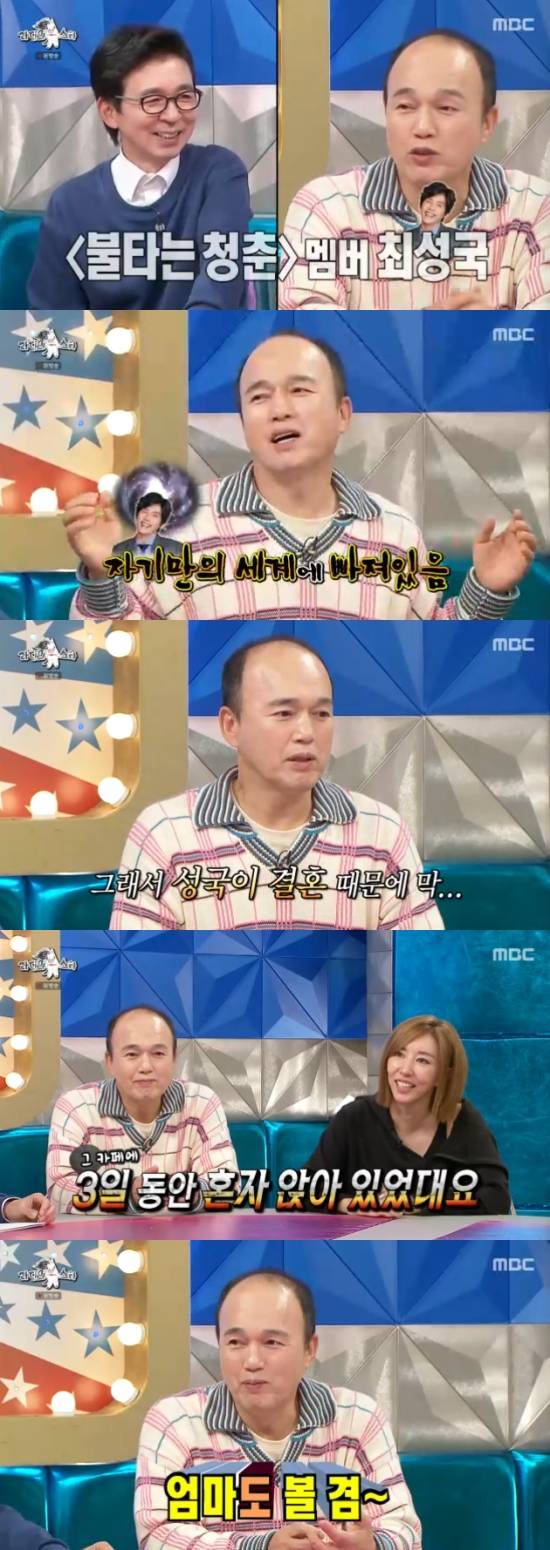 그리고 이날 김광규는 절친 최성국의 결혼으로 큰 충격을 받았던 일화를 전했다. 김광규는 "성국이가 자기만의 세계가 정말 확실하다. 그래서 절대로 결혼을 못할 줄 알았다"고 했다.