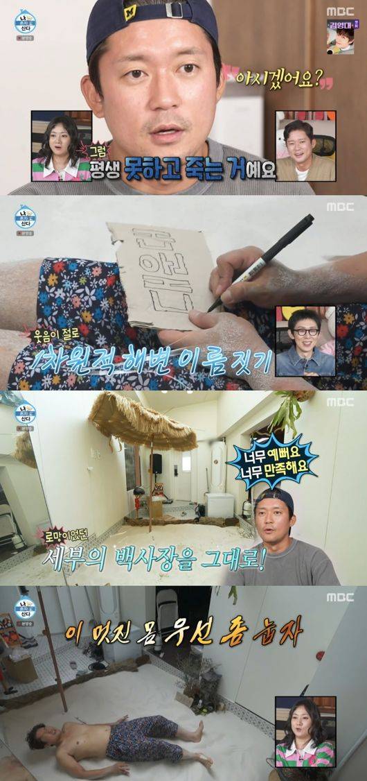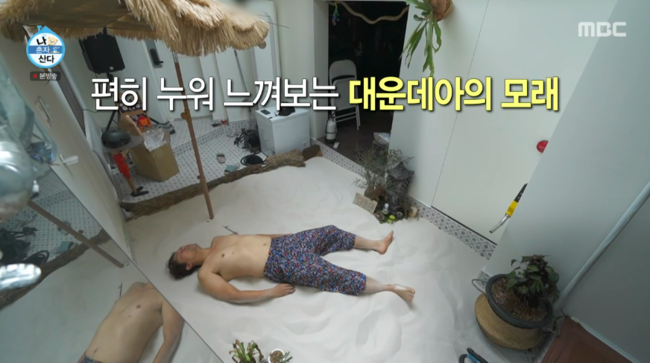 이어 김대호는 모래사장 위에 파라솔을 설치하고 ‘대운대’라고 이름을 지으며 로망을 실현했다. 그때 자신감 있게 상의탈의한 그는 모래찜질까지 즐기기도 했다.