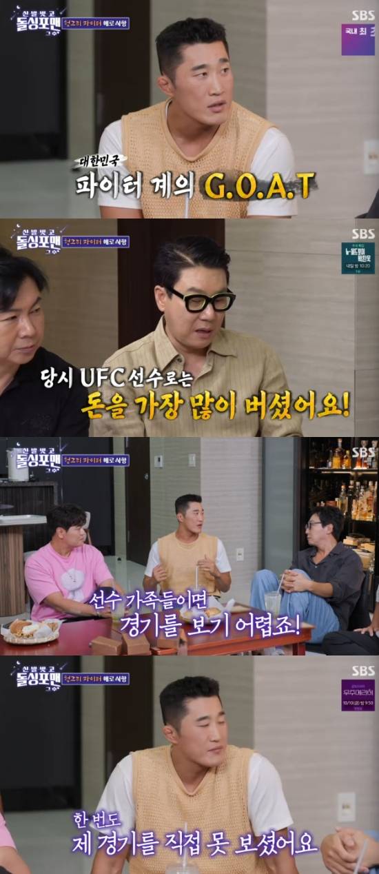 이어 김동현은 "다른 스포츠는 경기날 가족들이 응원을 오는데, 격투기는 가족들이 경기를 보는 걸 어려워한다. 2015년에 한국에서 UFC 경기가 한 번 열렸다. 가족들이 경기장에 왔는데 화장실에서 기도만 하셨다. 한 번도 제 경기를 직접 못 보셨다"고 말했다.
