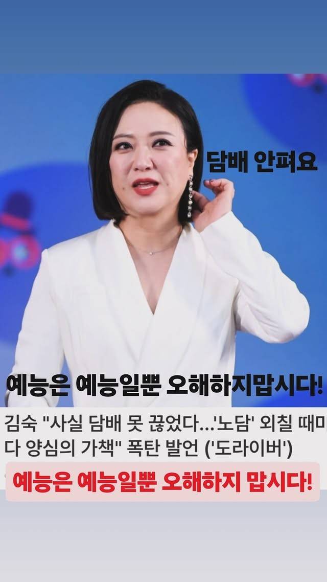 김숙은 "오늘은 여러분들에게 그동안 감춰왔던 저의 이야기를 털어놓으려 한다. 이미 눈치채신 분들도 있으시겠지만 네 맞아요. 저 아직 담배를 못 끊었습니다"라고 폭탄 발언을 했다.