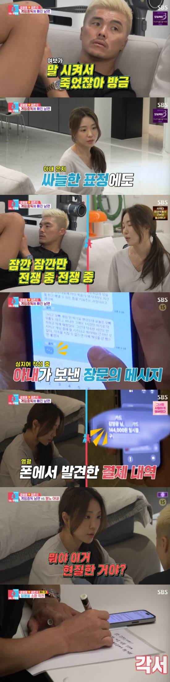 특히 김은지는 김영광의 휴대전화에서 조금 전 144,000원을 결제한 내역을 발견했고, 김영광이 현질을 했다는 것을 알았다. 결국 김영광은 앞으로 다시 게임을 하면 자신이 쓰고 있는 아내의 카드를 반납하겠다는 각서를 썼다.
