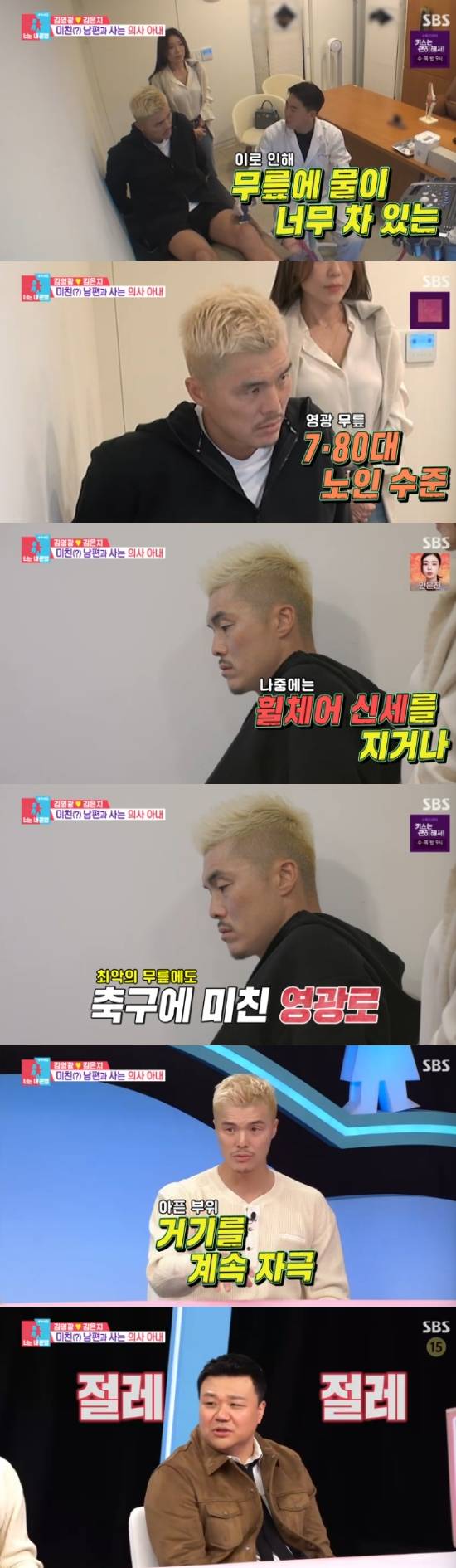 의사는 "이정도 무릎 상태면 보행이 힘든 정도다. 80대 노인의 무릎이라고 보면 된다. 나중에 휠체어 신세를 지거나 인공관절 수술을 해야한다"고 말해 아내 김은지를 걱정하게 했다.