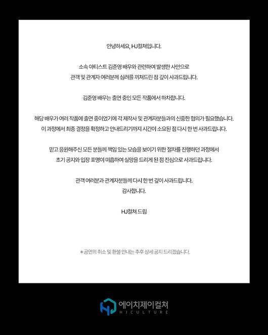 이에 대해 소속사 HJ컬쳐는 “온라인상 제기되고 있는 의혹들과 관련해 (김준영) 배우에게 그 어떠한 불법 행위도 없었음을 명확히 밝힌다”고 부인했다.