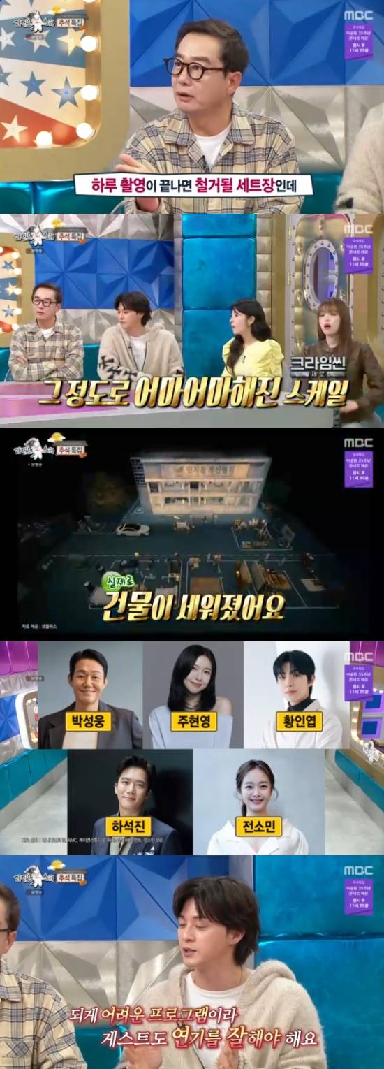 장진은 "이번에 '크라임씬' 스케일 남다르더라. 자본의 힘인가 싶었다. 실제로 건물을 세워놓고, 한강다리도 직접 구현을 해놨다. 예능 세트가 어마어마하더라. 하루만 촬영하면 철거를 해야하는건데, 너무 놀랐다. '돈 벌 생각이 없느건가?'라는 생각이 들었다"고 놀라워했다.