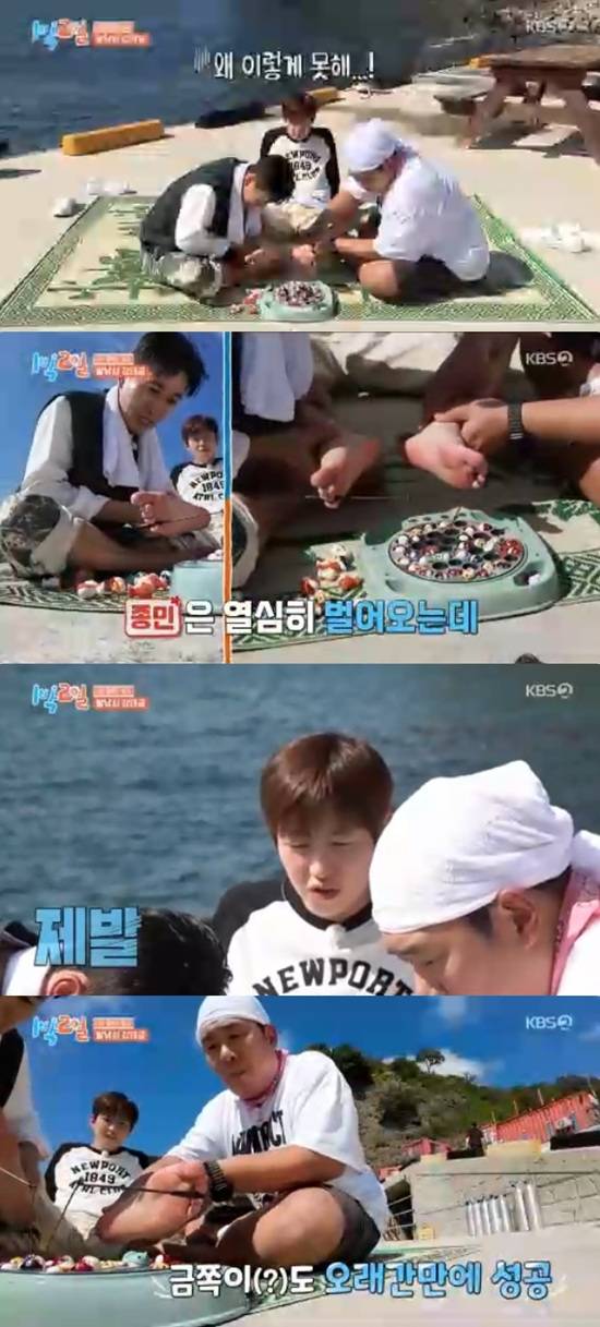 이날 김종민, 문세윤, 딘딘의 아래팀은 물회를 걸고 발낚시 강태공 게임을 시작했다.