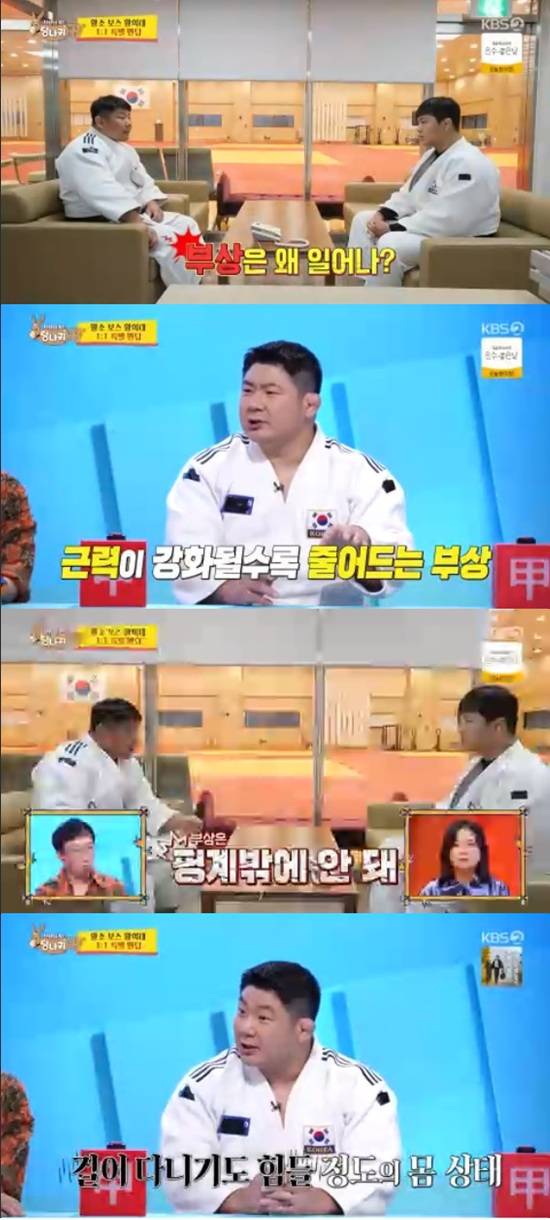 황희태는 김한수에게 부상은 근력 부족으로 일어난다며 그동안 근력 운동을 안 했다는 것이라고 지적했다. 근력이 좋으면 부상을 입어도 덜하다고.