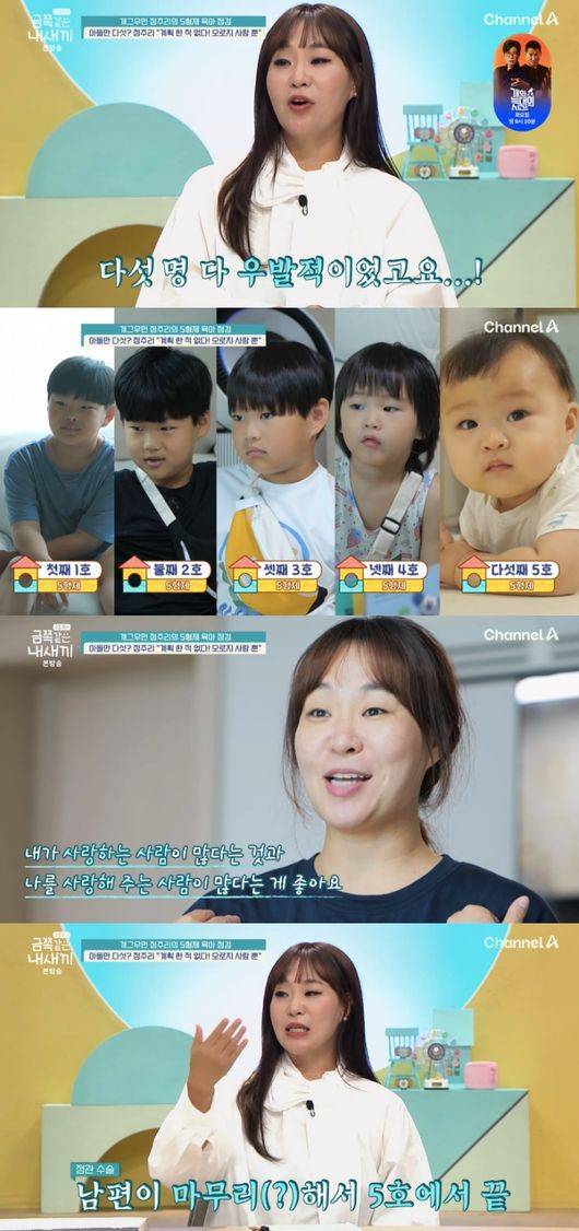 11세 첫째부터 이제 막 8개월 된 막내까지 5형제를 두고 있는 정주리는 “다둥이 계획적이었냐”라는 질문에 “다섯 명 다 우발적이었다. 우발적인 사랑으로 인해서”라며 “정말 많이 사랑해요. 사랑을 많이 하고 아끼고 배려하고 존경하고 그렇다”라고 수줍게 답했다.