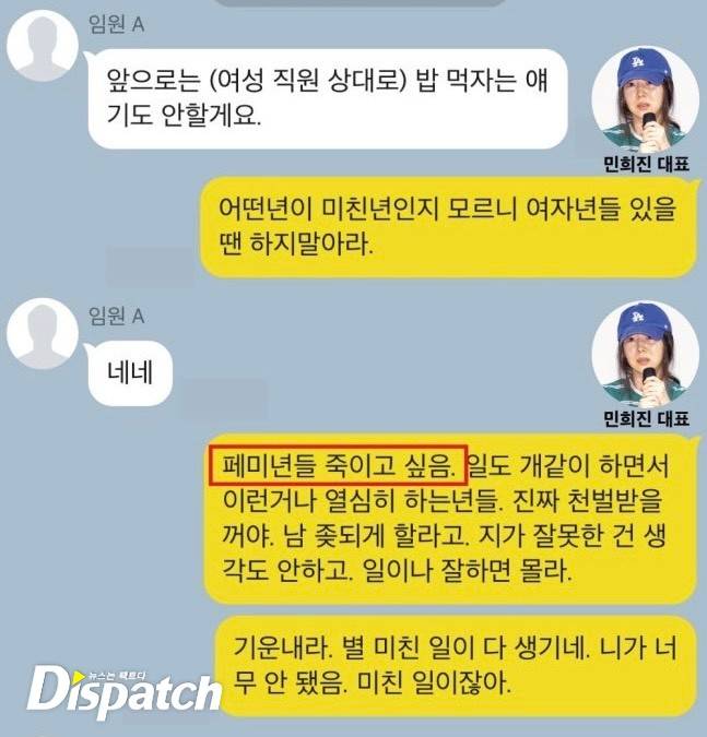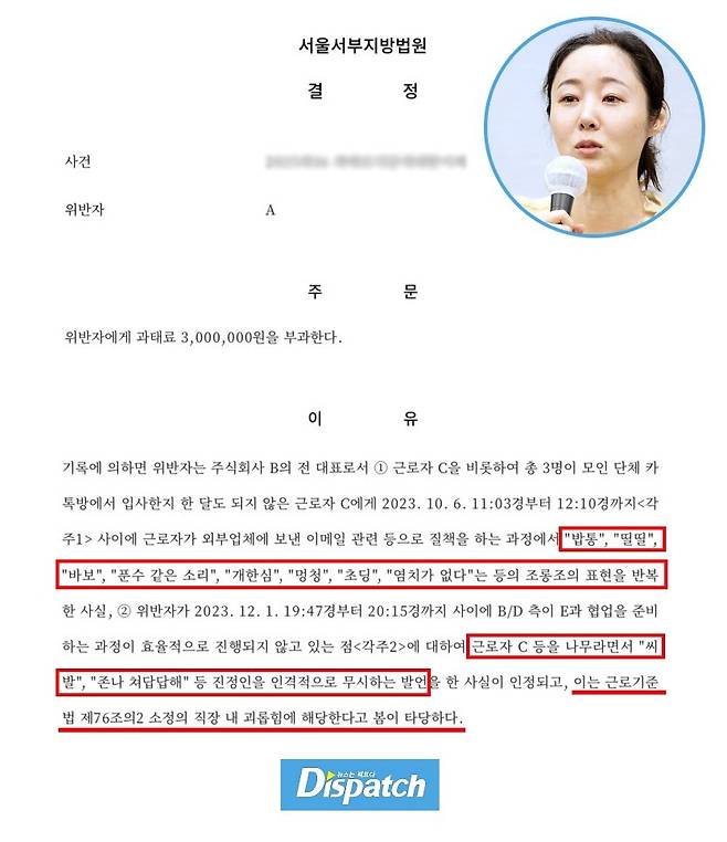 '디스패치'는 24일 서부지법 판결문을 입수했다. 민희진은 A씨 포함 총 3명이 모인 단체 카톡방에서 조롱의 표현을 반복했다. 당시 A씨가 어도어 입사 한 달이 되지 않은 상태였다.