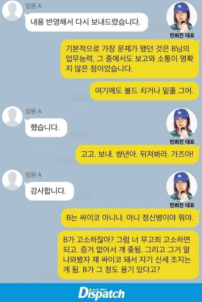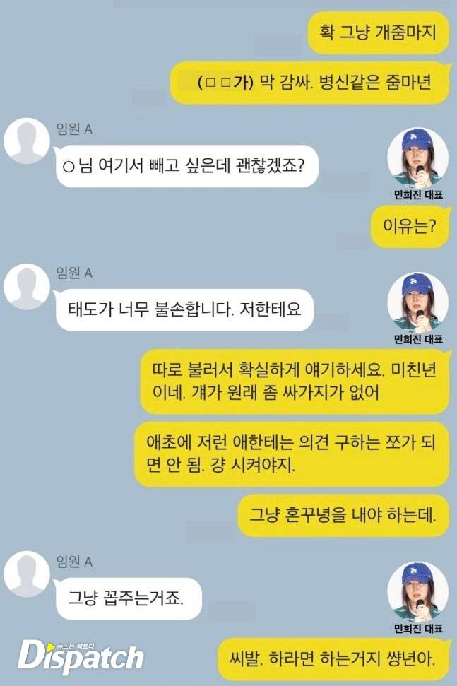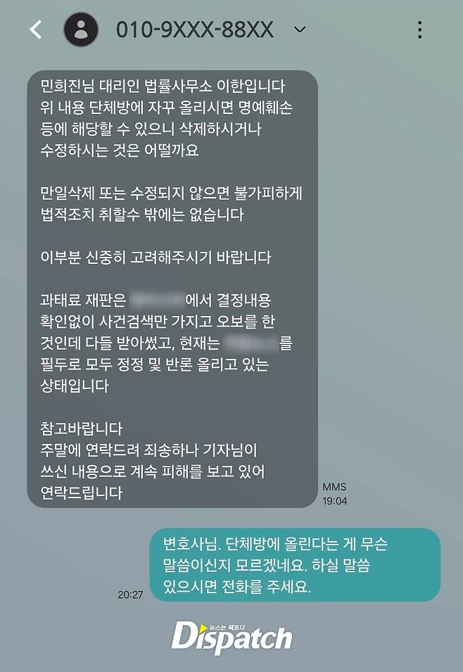 민희진의 (정체불명의) 법률 대리인이 '디스패치'에 기사 정정을 문자로 요청했다.