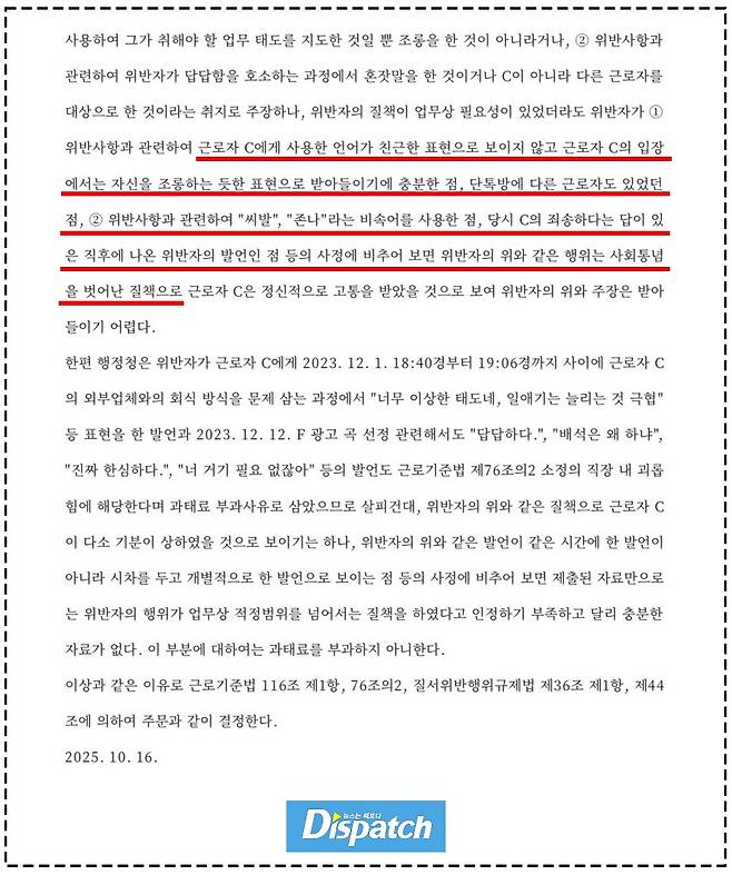 "진정인을 인격적으로 무시하는 발언을 한 사실이 인정된다. 근로기준법 제76조의 2 소정의 직장 내 괴롭힘에 해당한다. 나머지 2건은 (민희진의) 질책으로 진정인의 기분이 상하였을 것으로 보이기는 하나, 달리 충분한 자료가 없다." (재판부)