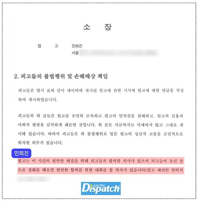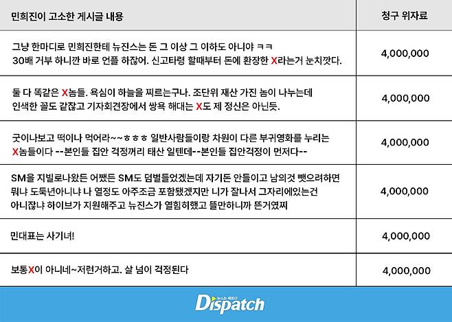 ‘디스패치’는 최근 민희진 측이 네티즌에게 보낸 고소장을 입수했다. 민희진 관련 기사에서 ‘년’이라는 욕설이 들어간 댓글을 채증, 300~400만원을 배상액으로 청구했다.