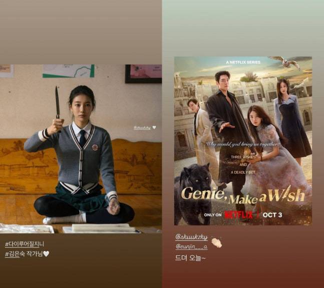 3일 송혜교는 자신의 SNS에 "'다 이루어질지니' 김은숙 작가님"이라는 글과 함께 하트 이모티콘을 덧붙였다. 공개된 사진 속에는 넷플릭스 시리즈 '다 이루어질지니' 속 수지의 스틸컷이 담겨 있어 눈길을 끌었다. 송혜교는 수지의 인스타그램 계정을 태그하며 "드디어 오늘"이라는 글을 남겨 기대감을 드러냈다.
