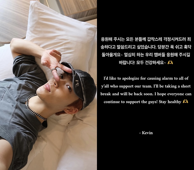 10일 케빈은 자신의 SNS에 검은 배경에 흰색 글씨의 글을 올리며 “응원해 주시는 모든 분들께 갑작스레 걱정시켜드려 죄송하다”고 전했다. 이어 “당분간 푹 쉬고 돌아오겠다, 열심히하는 우리 멤버들 응원해 주시길 바란다”라며 팀을 향한 애정을 드러냈다. 마지막에는 “모두 건강하라”는 인사로 팬들을 안심시켰다.