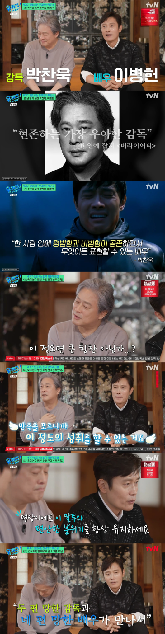 24일 방송된 tvN '유퀴즈 온더 블럭'에서 박찬욱 감독은 이병헌에 대해 "이병헌은 슈퍼스타이지만 대부분 연기자들, 예술가들은 까다롭고 예민하다. 스타가 예민하고 까다로우면 주변의 여러 사람이 피곤하다. 이병헌은 그렇지 않다는 게 제일 좋고 고맙고 또 놀랍다. 어떻게 그럴 수 있는지"라고 칭찬했다.