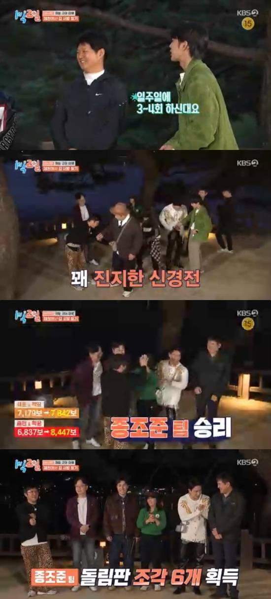 멤버들은 본 미션으로 만보계를 이용한 합산 걸음수 대결에 나섰다. 3분 뒤 짝꿍 걸음 수에 멤버들의 만보계 숫자 합이 적은 팀이 패배라고.