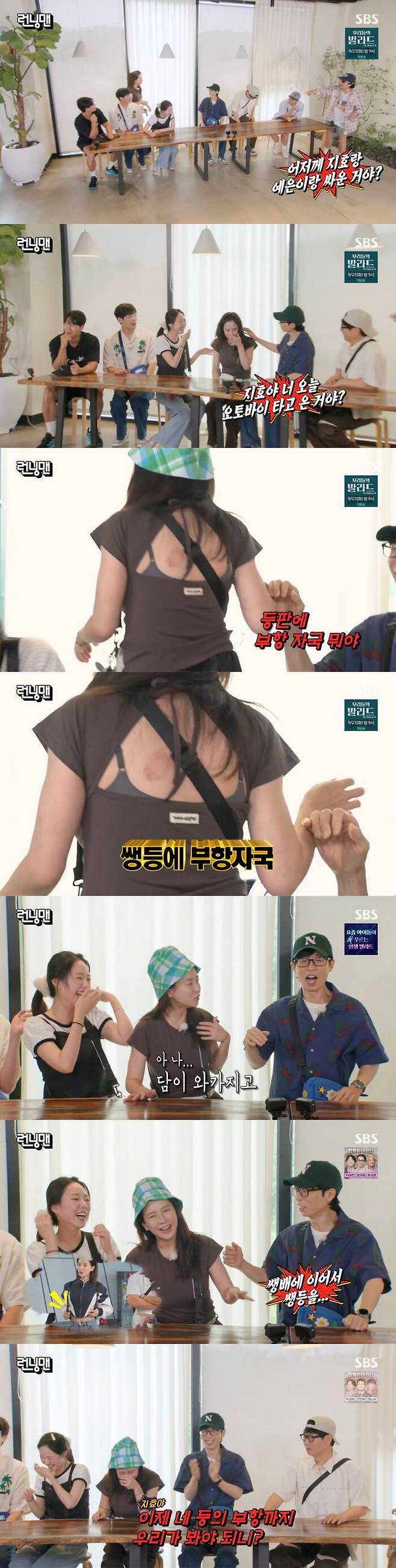 이어 유재석은 "지효야 등판에 부항자국 뭐야"라며 "쌩배에 이어 쌩등까지 공개하는 거냐"라고 송지효의 등에 남은 부항 자국을 공개했다.