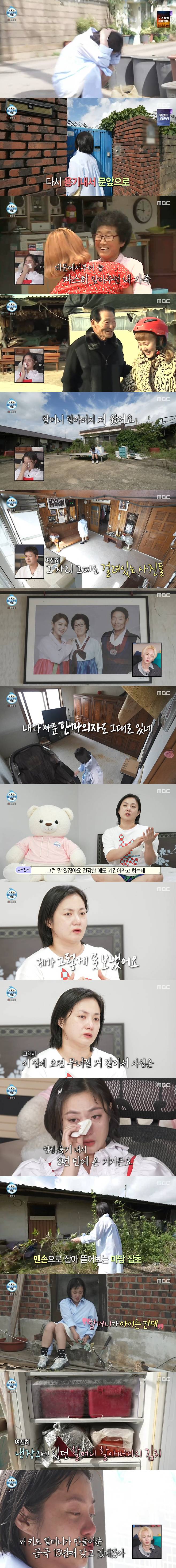 용기 내 왔다는 박나래는 "너무 늦게 왔다"면서 마당 잡초를 맨 손으로 뽑고, 할머니가 아끼던 집게를 보며 할머니와의 추억을 떠올리기도 했다. 특히 냉장고 속 할머니 김치에 "나한테 김치가 되게 특별한 의미다"면서 눈물을 쏟아 안타까움을 자아냈다.