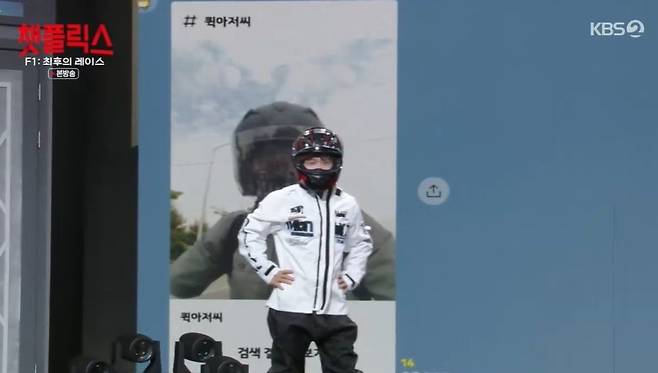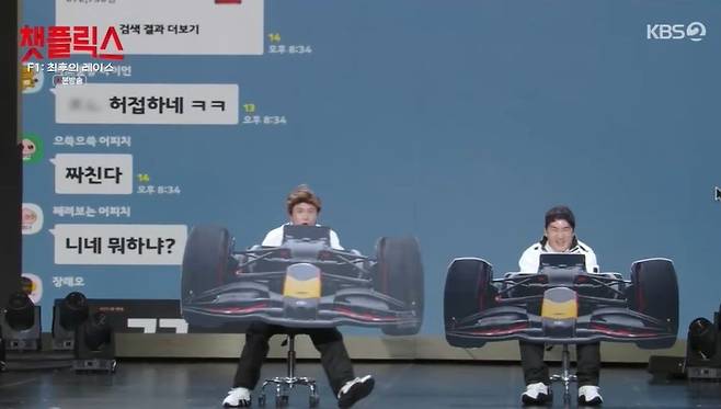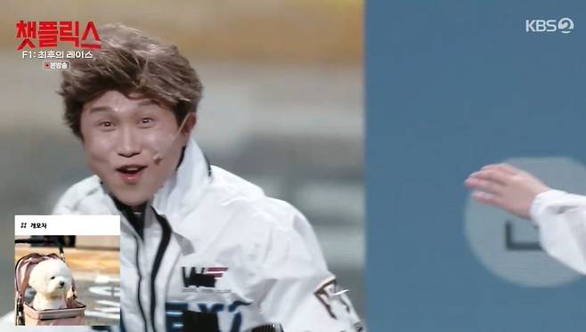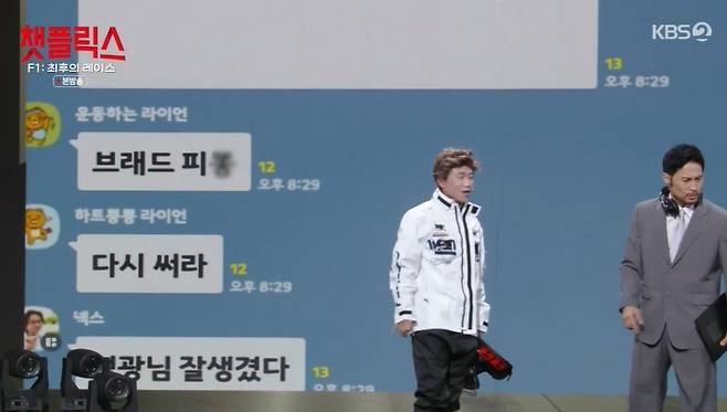 그런 가운데 '챗플릭스'에선 영화 브래드 피트 주연의 'F1 더 무비'를 패러디했다. 이상훈은 헬멧을 벗었지만, "이제 헬멧을 벗어주세요", "대갈장군"이란 말이 쏟아졌다. 이어 브래드 피트로 박성광이 등장하자마자 채팅창에선 "퀵아저씨"라고 말했다. 박성광은 자신이 브래드 피트라고 강조했지만, "브래드 피X"이란 말이 돌아오기도.