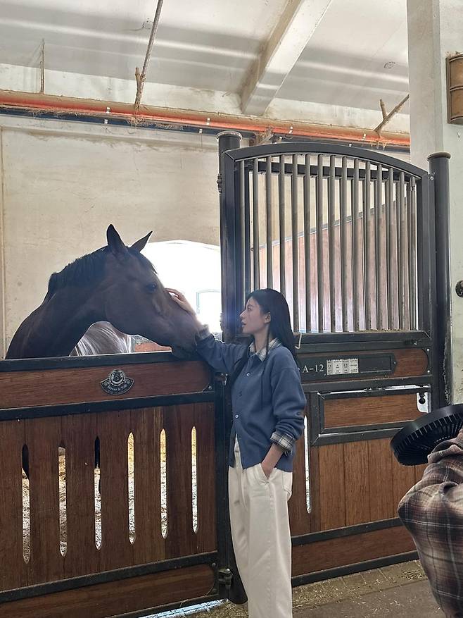 촬영 내내 말과 교감하며 차분한 분위기를 자아냈고, 또 다른 사진에서는 말과 자연스럽게 눈을 맞추며 유쾌한 포즈를 선보였다.