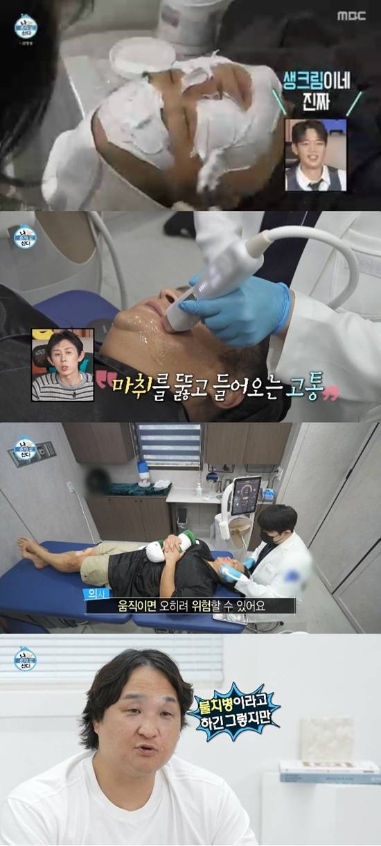 구성환은 마취크림을 생크림처럼 얼굴에 바른 상태로 20분 대기한 뒤 시술을 받게 됐다. 의사는 줄기세포 시술 전 고주파로 피부층을 깨우는 과정부터 시작했다.