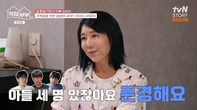 사유리는 아들 세 명을 키우는 김정민에게 "존경한다"고 말하면서 "아들 하나로도 체력이 모자라는데, 세 명이면 어떤 느낌이냐"라고 물었다. 이에 김정민은 "전쟁터다. 하루 종일 시끄럽고, 엄마도 목소리가 커지고 무서워진다"라고 고백했다.
