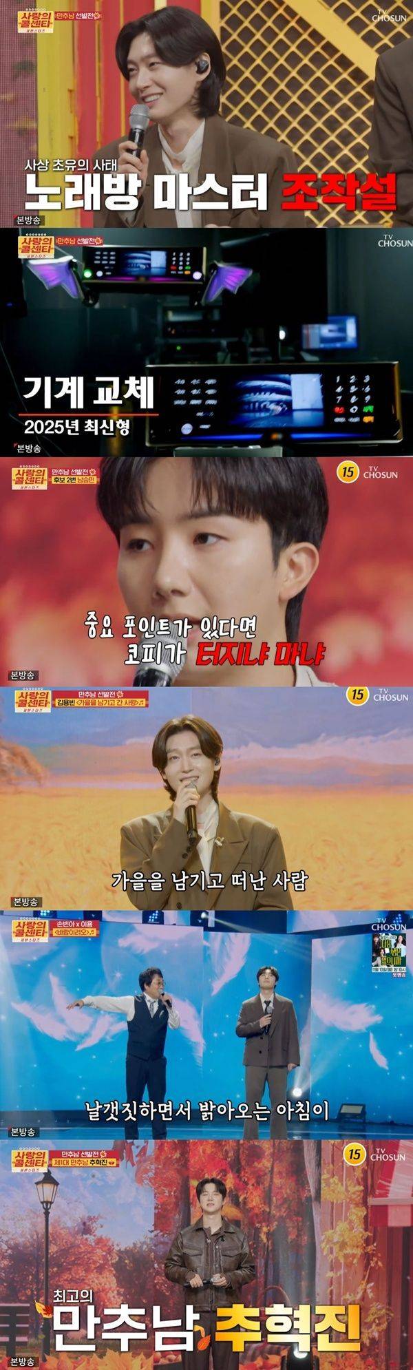 '최고의 만추남' 선발전이 시작되기 전, 김용빈은 6연속 97점에 대해 의심을 품으며 "노래방 마스터가 조작인 것 같다. 무조건 교체를 해야한다"고 해 웃음을 안겼다. 이에 김성주는 "노래방 마스터를 교체하기로 했다. 새로운 마스터를 모셨다"고 발표했다.