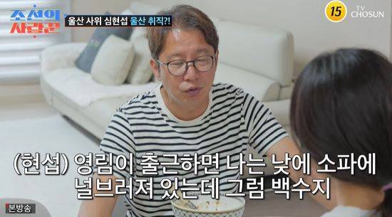 이어 심현섭은 "영림이는 출근하고 나는 낮에 소파에 널브러져 있는 백수였다. 그러던 차에 '울산시대'라는 복이 굴러들어온 거다"라며 울산에서의 취직에 대한 기쁜 마음을 드러냈다. 심현섭의 속마음을 들은 정영림은 "고생 많았다"라며 위로했다.