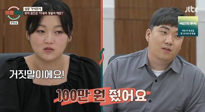 남편은 아내의 문제로 아내의 생활비로 인한 빚이라고 주장했다. 남편은 "생활비 뿐 아니라 카드값도 100만원 가까이 줬다"라고 말했다. 하지만 아내는 "카드 값 메꿔주는 거랑 엄마 생활비 10만원 주는 것 말고는 없다"라고 반박했다.