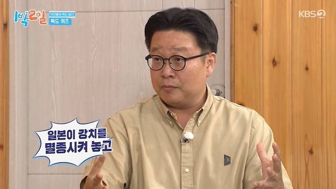 이어 서경덕은 독도 퀴즈를 내며 강치에 관해 설명했다. 독도의 옛 이름인 '가지도'는 강치가 많아 붙여진 지명. 서경덕은 "1900년대 초 일본에서 불법으로 강치잡이를 해서 개체 수가 급감했다. 멸종시켰다고 해도 과언이 아니"라면서 "강치를 팔아서 경제적인 이득을 얻으려는 것도 있지만, 전쟁 물자로 사용하기 위해서였다"라고 설명했다.