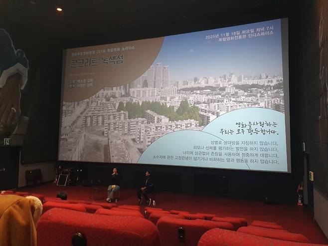 이날 상영된 작품은 이성민 감독의 장편 다큐멘터리 <콘크리트 녹색섬>이었다. 지난 씨네만세에서 소개했듯, 작품은 개포 주공아파트 1단지 일대 재개발과 관련해 나무들을 지키려는 감독의 노력을 보인다. 재개발이 될 거라며 20여 년 동안 관리되지 않은 단지는 나무에겐 도리어 축복과도 같았다. 서울 어느 곳에서도 찾아보기 힘들었던 자연이 사람 사는 터전에서 모습을 드러냈다. 사람의 손길을 타지 않은 나무가, 자연이 어떤 모양이 되는지를 이곳이 확인케 했다. 그 울창함이란 숲이라 불러도 좋을 모양이 아닌가.
