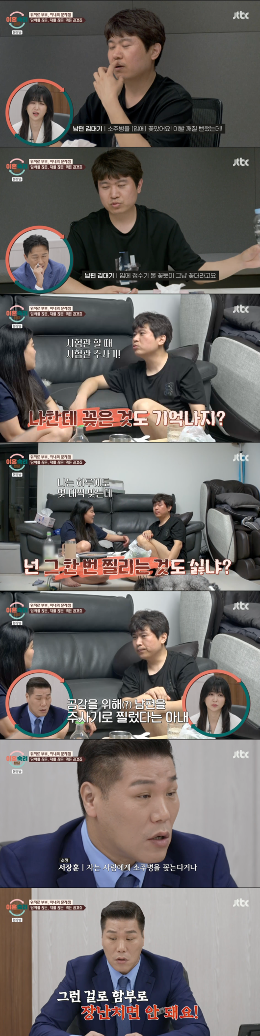 이에 방송인 서장훈은 "절대 그런 걸로 함부로 장난치면 안 된다"라며 생명을 다루는 도구를 폭력적으로 사용한 아내의 행동에 단호하게 경고했다.