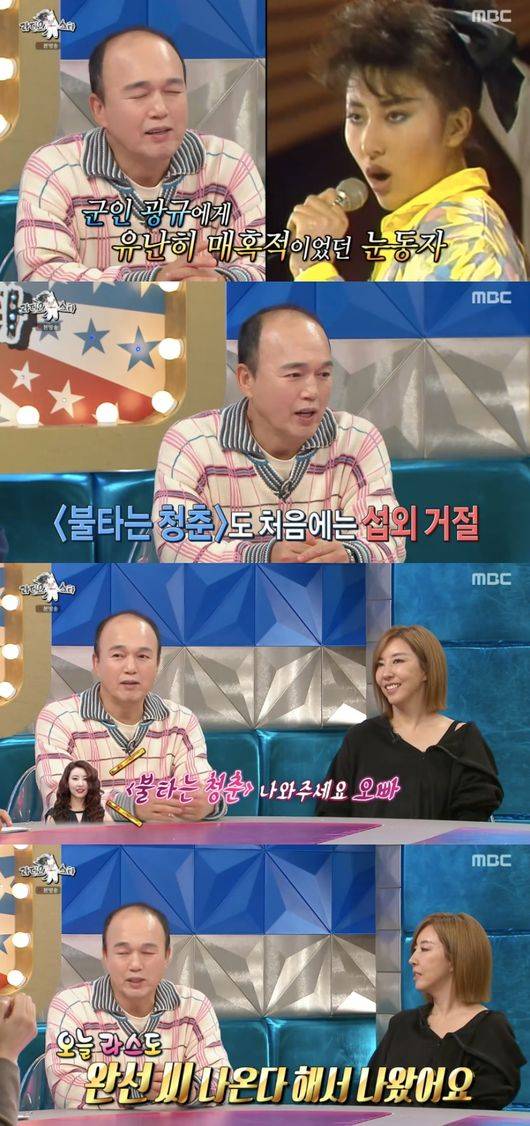 한편, 김광규는 김완선을 향한 여전한 팬심을 고백했다. 그는 군대에서 데뷔 무대를 보고 반하게 됐다며 “80년대 인기 가수는 이은하, 혜은이였다. 전성기였는데 그때 김완선 등장은 제니 느낌이다. 군인들이 너무 좋아했다. 브로마이드를 철모에 넣고 훈련 갔다”라고 좋아하게 된 계기를 설명했다.