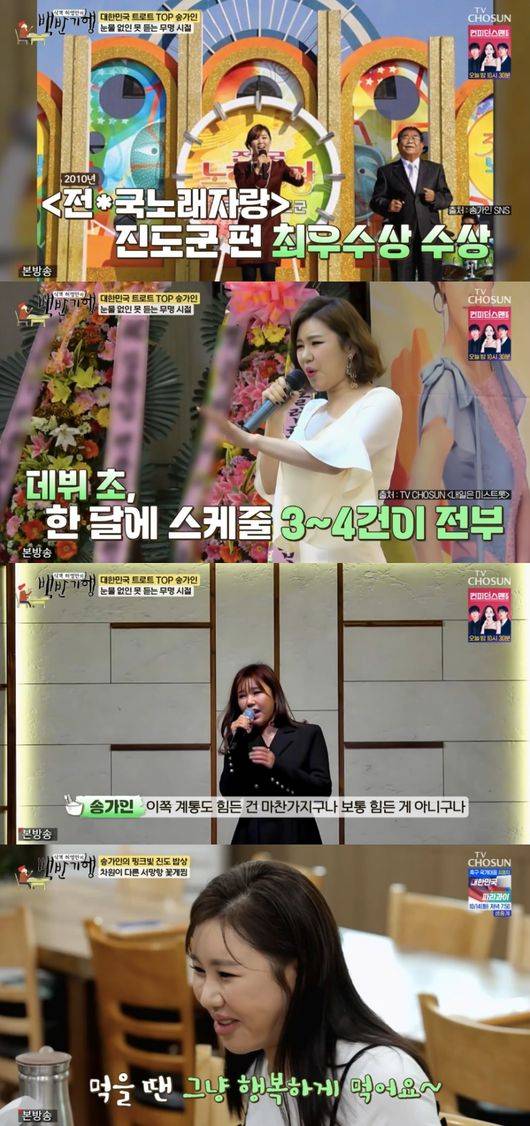 또 송가인은 “혼자 다닐 때는 버스 타고 기차 타고 다니고, 대기실도 없어서 화장실에서 옷 갈아입고 혼자 겪으니까 너무 힘들어서 ‘그만 해야 되나’ 라는 생각도 많이 했었다”라고 고백해 눈길을 끌었다.