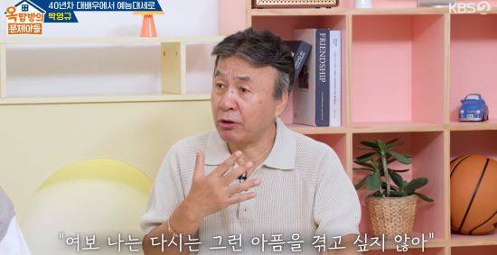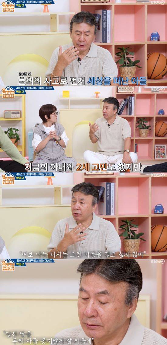 이후 박영규는 "내가 상처가 있다. 아들이 하나 있었다"라며 20년 전 세상을 떠난 아들에 대해 언급했다. 이어 "그래서 고민을 했다. 아내는 '나는 낳을 수 있다'고 했다. 그런데 내게 아들에 대한 트라우마가 있고 상처가 아직 안 지워졌다. 겉으로는 멀쩡해 보여도 상처가 안 지워져 겁이 났다"라며 속마음을 털어놨다.