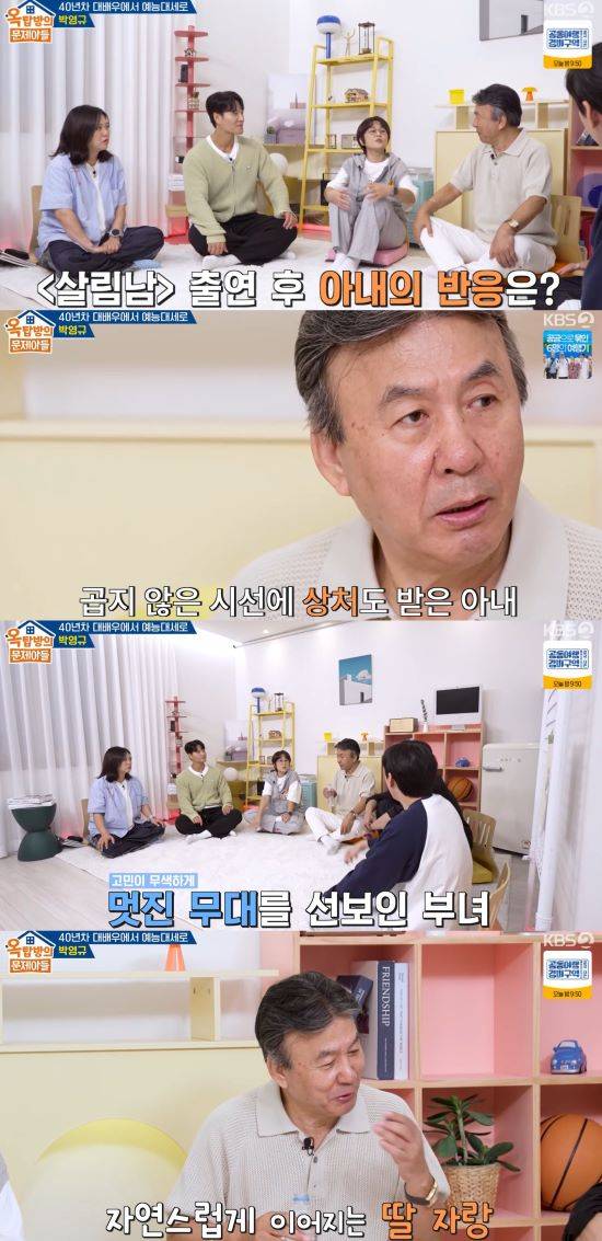 또 '살림남' 출연에 대해 "처음에는 많이 어려웠다. 아내가 처음에 댓글을 보고 상처를 많이 받았다. 다시는 안 나간다고 했다"라며 고비를 겪었다고 토로했다. 박영규의 아내는 데미 무어를 닮았다는 내용의 방송이 전파를 탄 후, 악플에 시달렸다고. 그러나 박영규의 위로 끝에 아내가 상처를 극복할 수 있었다고 밝혔다.