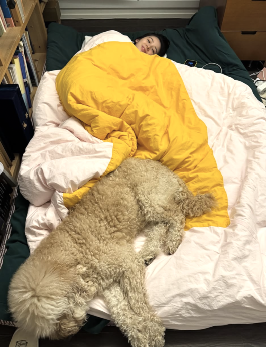 함께 공개된 사진에는 아이린이 남편과 반려견 두비, 그리고 다른 반려견들과 함께한 화보 촬영 현장 모습이 담겼다. 또 다른 사진에서는 아이린이 두비와 나란히 누워 잠든 모습, 사랑스럽게 교감하는 일상 등이 공개돼 팬들의 마음을 울렸다.