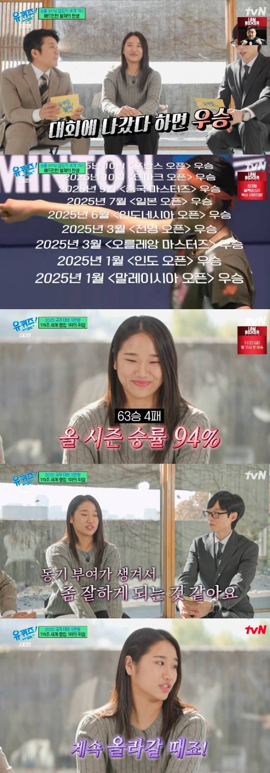 19일 방송된 tvN 예능 프로그램 '유 퀴즈 온 더 블럭'에서는 승률 94%의 배드민턴 세계 챔피언 안세영이 출연해 이야기를 나눴다.