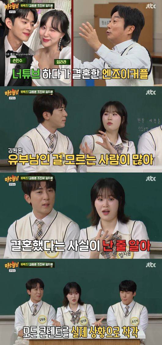 엄지윤은 실제로 오해받은 적이 있다며 “원훈이가 유부남인 걸 모르는 사람이 많다. 일반인 분과 했는데 알려지지 않아서. 결혼한 사람이 난 줄 안다. 나한테 결혼 축하한다고 하는 사람도 있다”라고 고백했다.