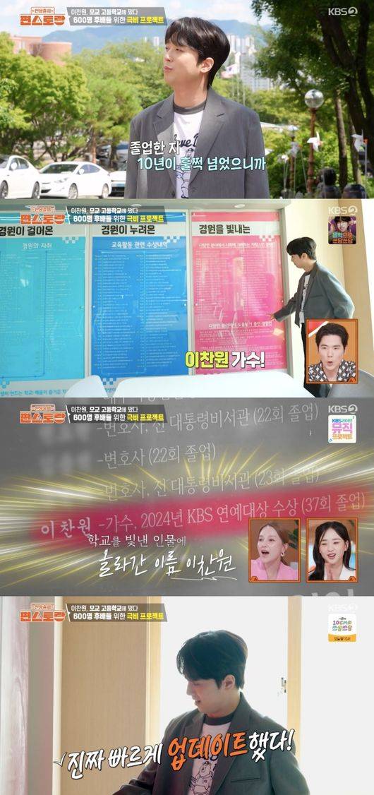 24일 방송된 KBS 2TV 예능 ‘신상출시 편스토랑’(이하 ‘편스토랑’)에서는 이찬원이 모교를 방문한 모습이 그려졌다.
