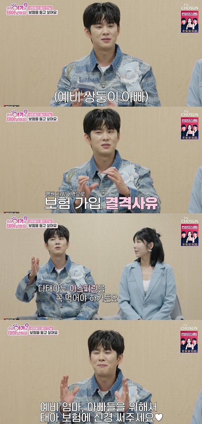 스튜디오에서 이를 지켜보던 손민수는 부부의 상황에 공감했다. 오는 10월 쌍둥이의 아빠가 될 예정인 손민수는 "저희도 (태아보험 가입을) 거절당했다. 아스피린을 약국에서 처방전 없이 구매할 수 있는데 처방받은 내역이 있으니 거절당한다. 다태아는 아스피린을 꼭 먹어야 한다"라고 밝혔다.